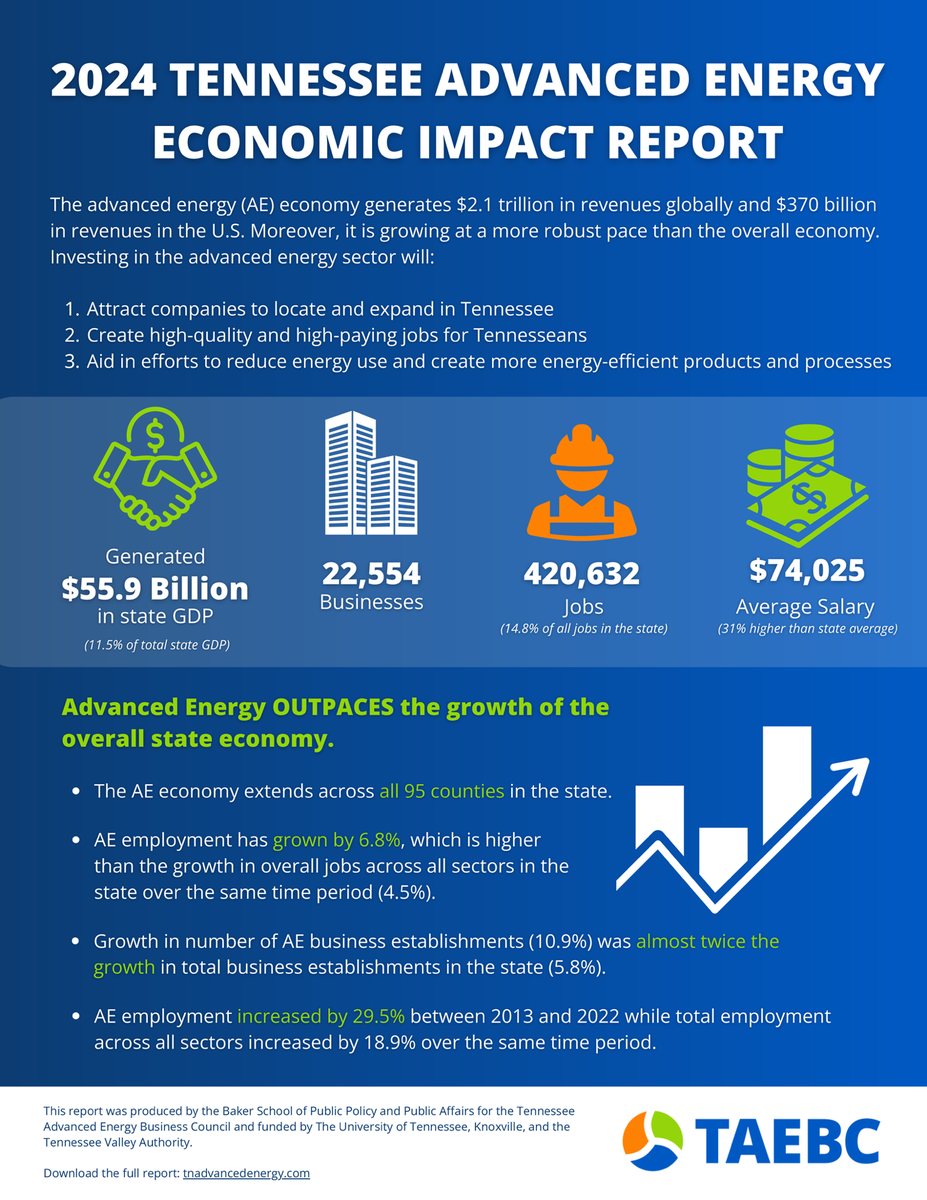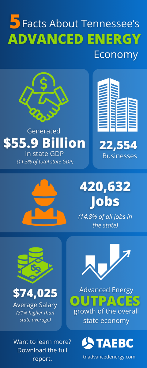 Every three years, the Tennessee Advanced Energy Business Council releases an Advanced Energy Economic Impact Report to provide context for decisions by public officials and private sector leaders to make lasting contributions to Tennessee’s economic base for the next decade and beyond.
