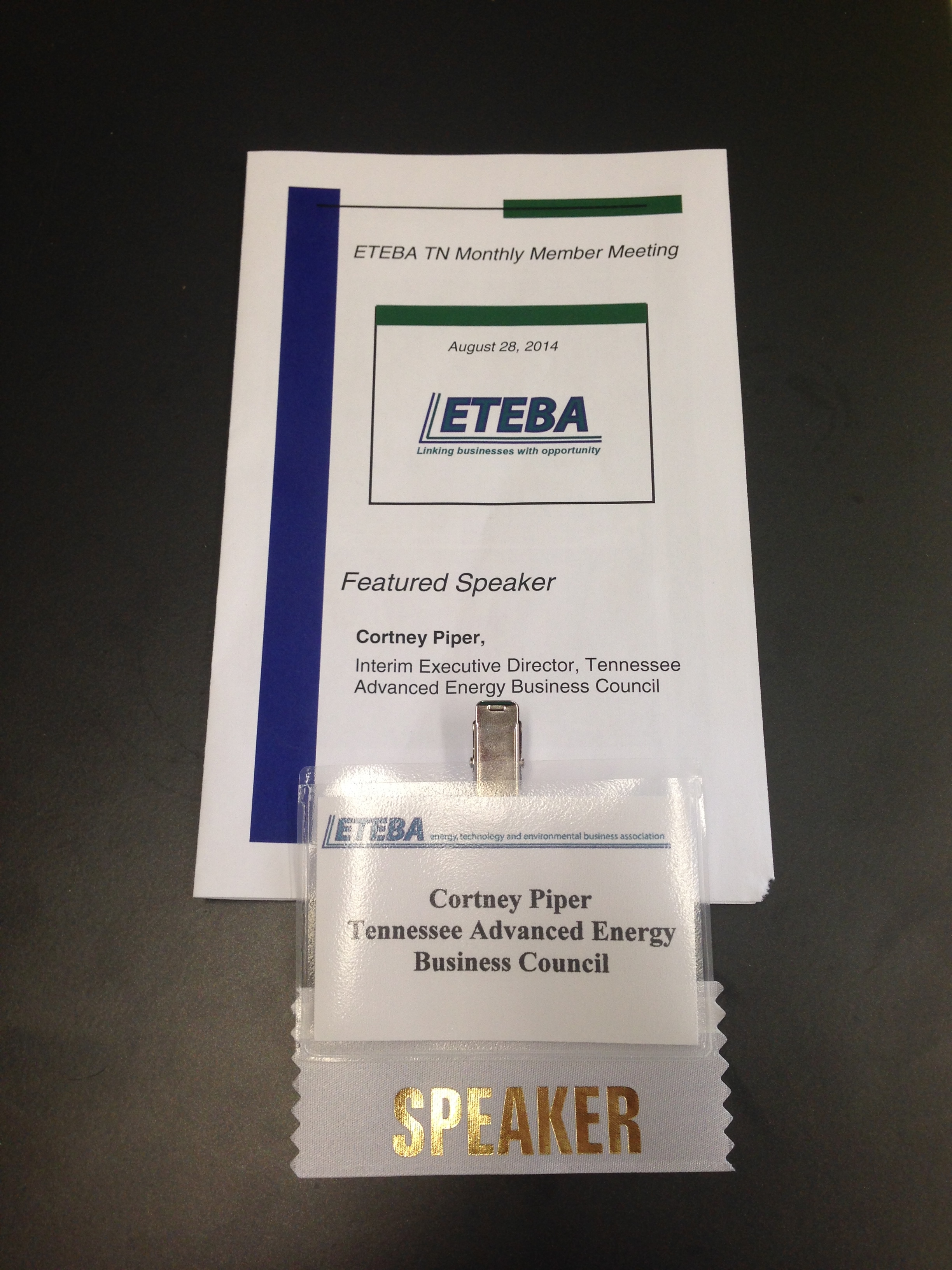 The Energy Technology and Environmental Business Association (ETEBA) hosted the Tennessee Advanced Energy Business Council’s (TAEBC) Cortney Piper during its monthly dinner meeting on August 28 at the Holiday Inn Cedar Bluff in Knoxville. Piper spoke about the Tennessee Advanced Energy Business Council and its mission to promote advanced energy as a job creation and economic development strategy.